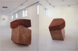 Perhaps, the creative potentials of “silence” as a referential withdrawal can be more fully encountered through contemporary rereadings of Minimalism - as exemplified by Michael Gitlin’s sculptures that simultaneously remember and forsake formalist concepts and in a manner described by Paul de Man, “open poetic space by a deep division of meaning”. Through their subtly unfolding and vague alliance of wobbles and planes, Gitlin’s sculptures drift clandestinely between semantic clarity and obscurity that foil attempts at interpretation. These objects reveal themselves tenebrously through a succession of small and irresolved semantic moments. Like Edgar Allan Poe’s anonymous culprit left unnamed after an analytically exhaustive evidencing in “The Mystery of Marie Roget”, the weave of a monumental repose of simplified solid wood forms and a truant geometry presents itself without salient representational truth. A certain anonymity of semantic evidence is dispersed between vagueness or opaqueness and specificity of the sculptural body. It is, after all, “precisely the ambiguity of the world that disrupts the fluid continuity of narrative”. (Roland Barthes)