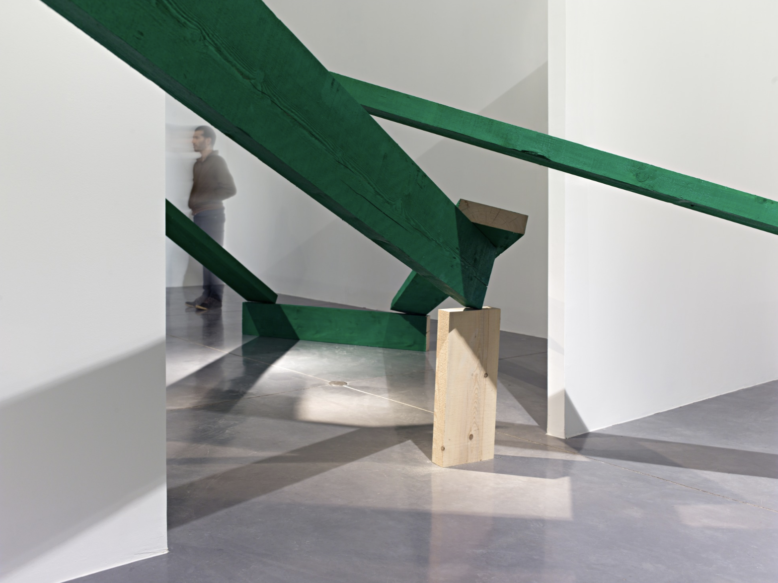 This interface has been identified by Annelie Pohlen, who finds in Broken Infinity some conceptual paradoxes that extend from the work’s title to its concrete experience. 67 meters of massive wooden beams painted green create a winding yet angular path that spreads across a white room, penetrates the architectonic crust and wounds it. The beams are supported by wooden tripods, which raise them to varying heights, creating a kind of broken Mobius ring, like the mathematical sign for infinity (∞). However, the conversion of a linguistic sign and of an abstract (mathematical, philosophical) concept into the very final and physical entity of the sculpture is in and of itself a conceptual rupture, like a botched transfiguration, or a failed attempt by infinity to come down to earth. “The attempt to give physical form to the logical link between the Unimaginable, on the one hand, and everyday experience, of fracture, on the other, […].